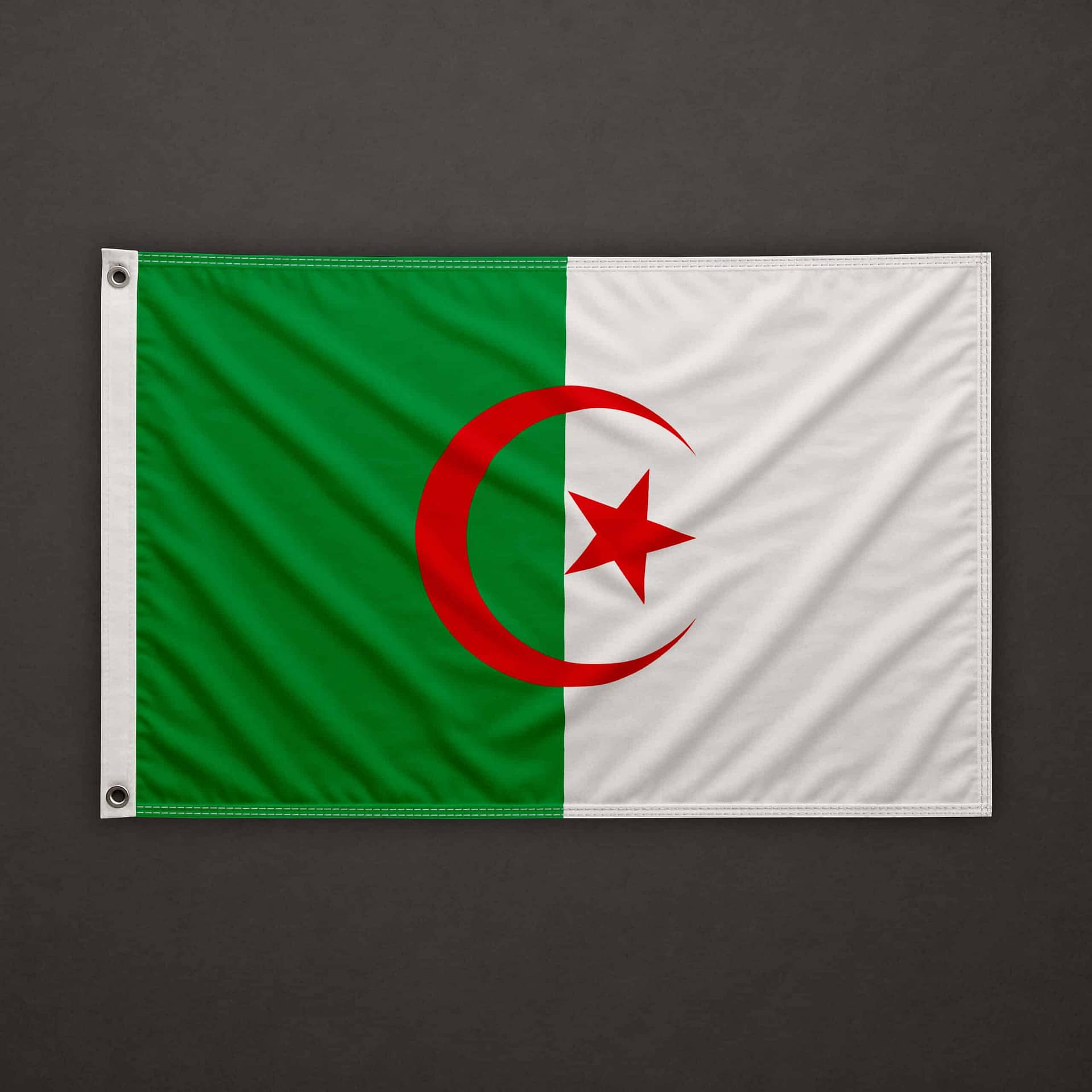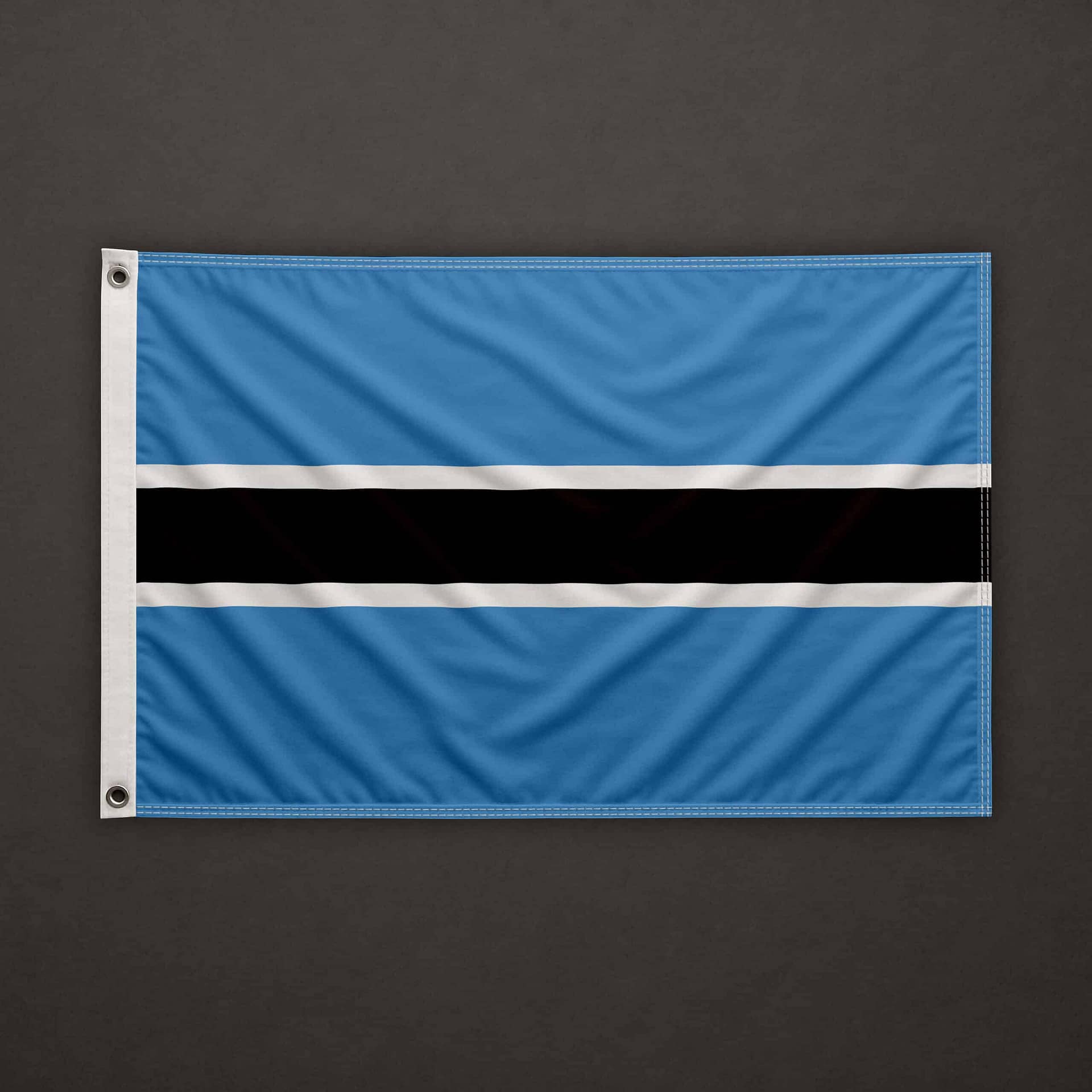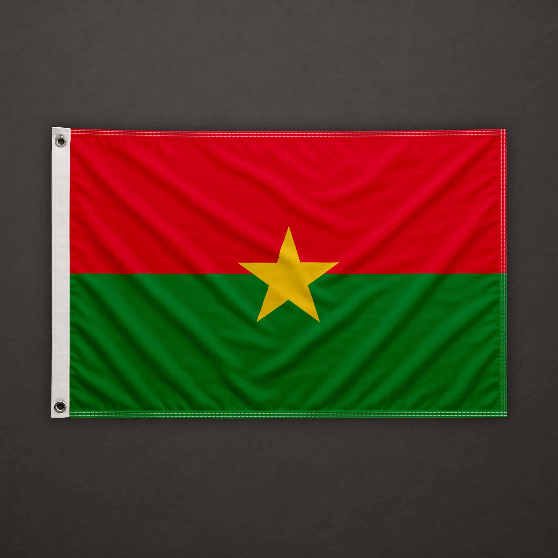 On the left side (hoist edge), a pocket for 6mm stick, open at the top and at the bottom. The top, bottom, and right sides are clean cut (hot cut). The flag is equipped with a 6mm stick already installed, 40cm long.
