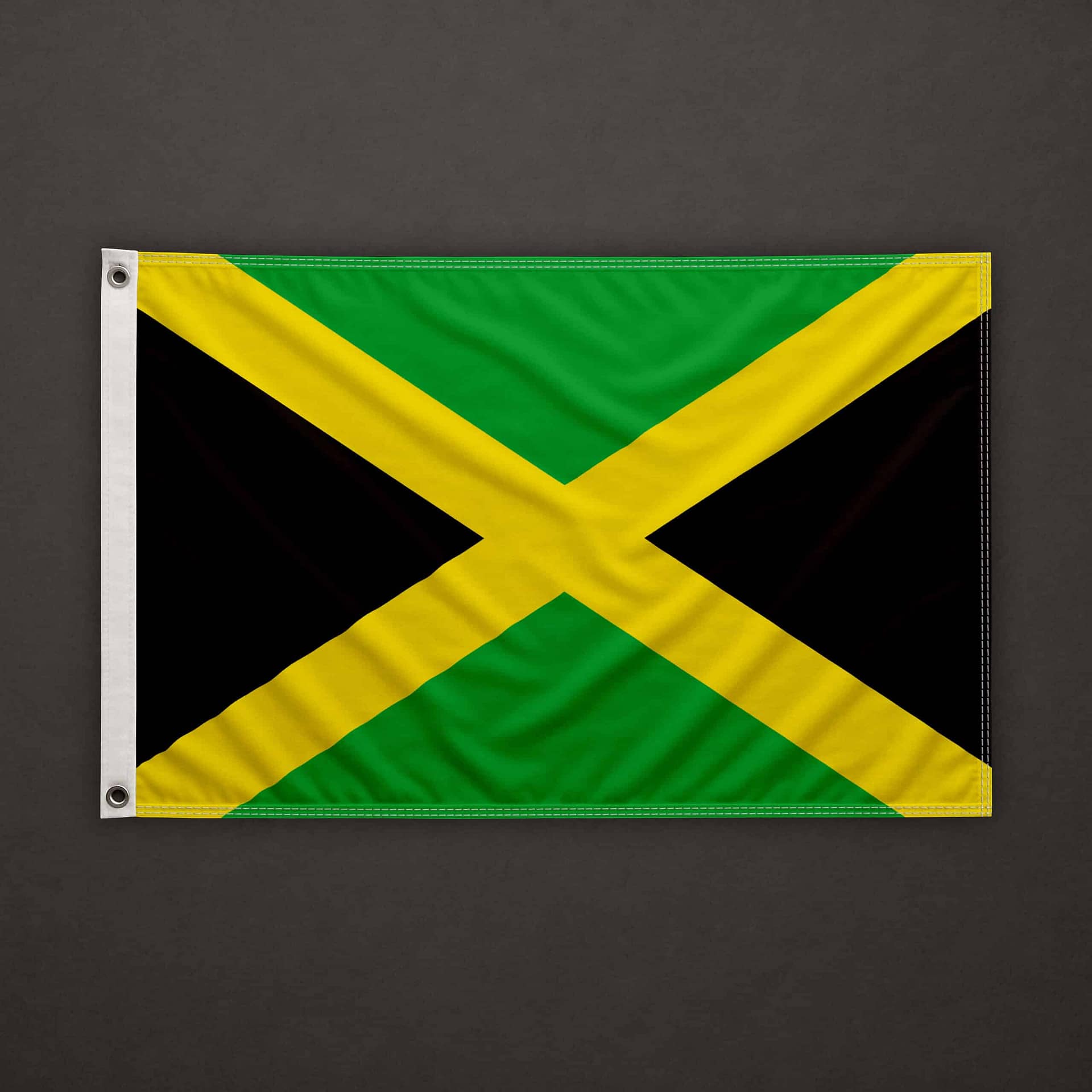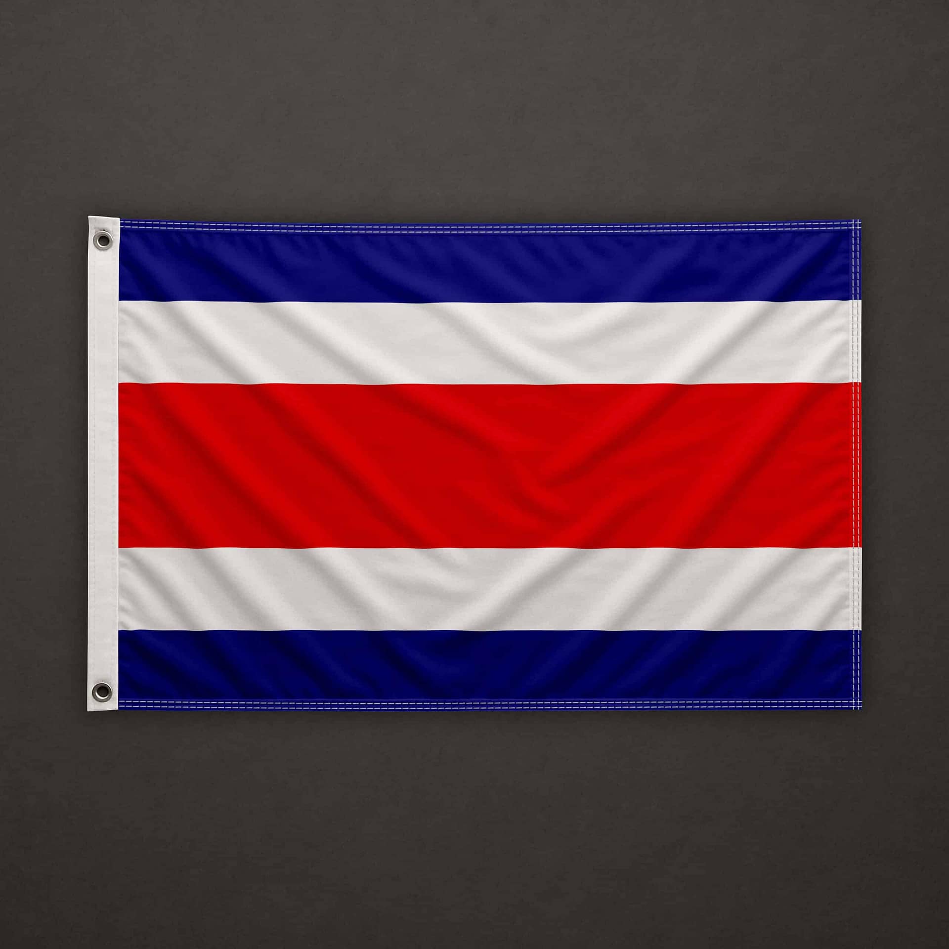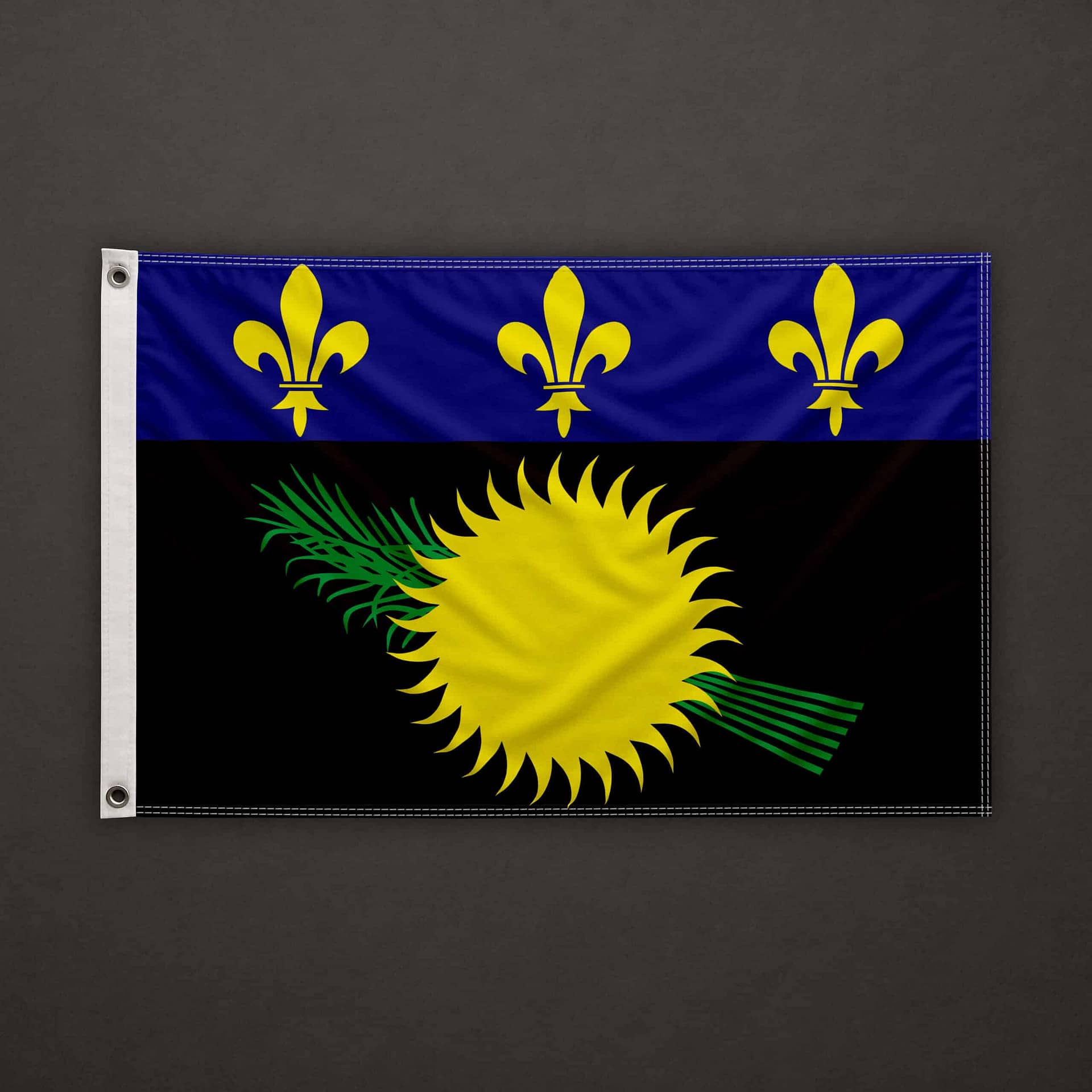 On the left side (hoist edge), a pocket for 6mm stick, open at the top and at the bottom. The top, bottom, and right sides are clean cut (hot cut). The flag is equipped with a 6mm stick already installed, 40cm long.