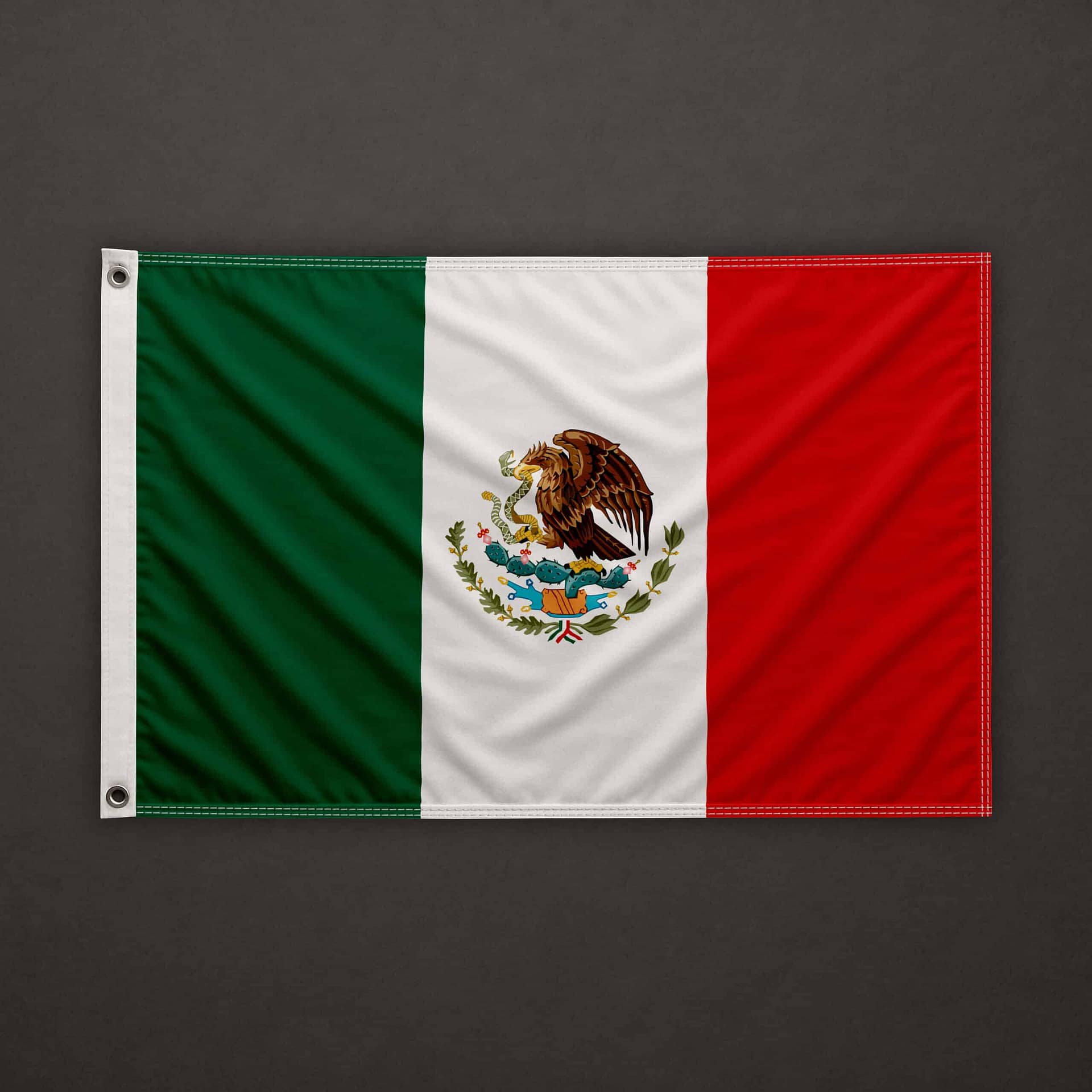 On the left (hoist edge) side, a double polyester reinforcement tape (20+20 mm) is secured with double stitching. Two sturdy eyelets made of corrosion-resistant metal are fitted at the top-left and bottom-left corners. The top, bottom, and right sides have double perimeter hems with double stitching.