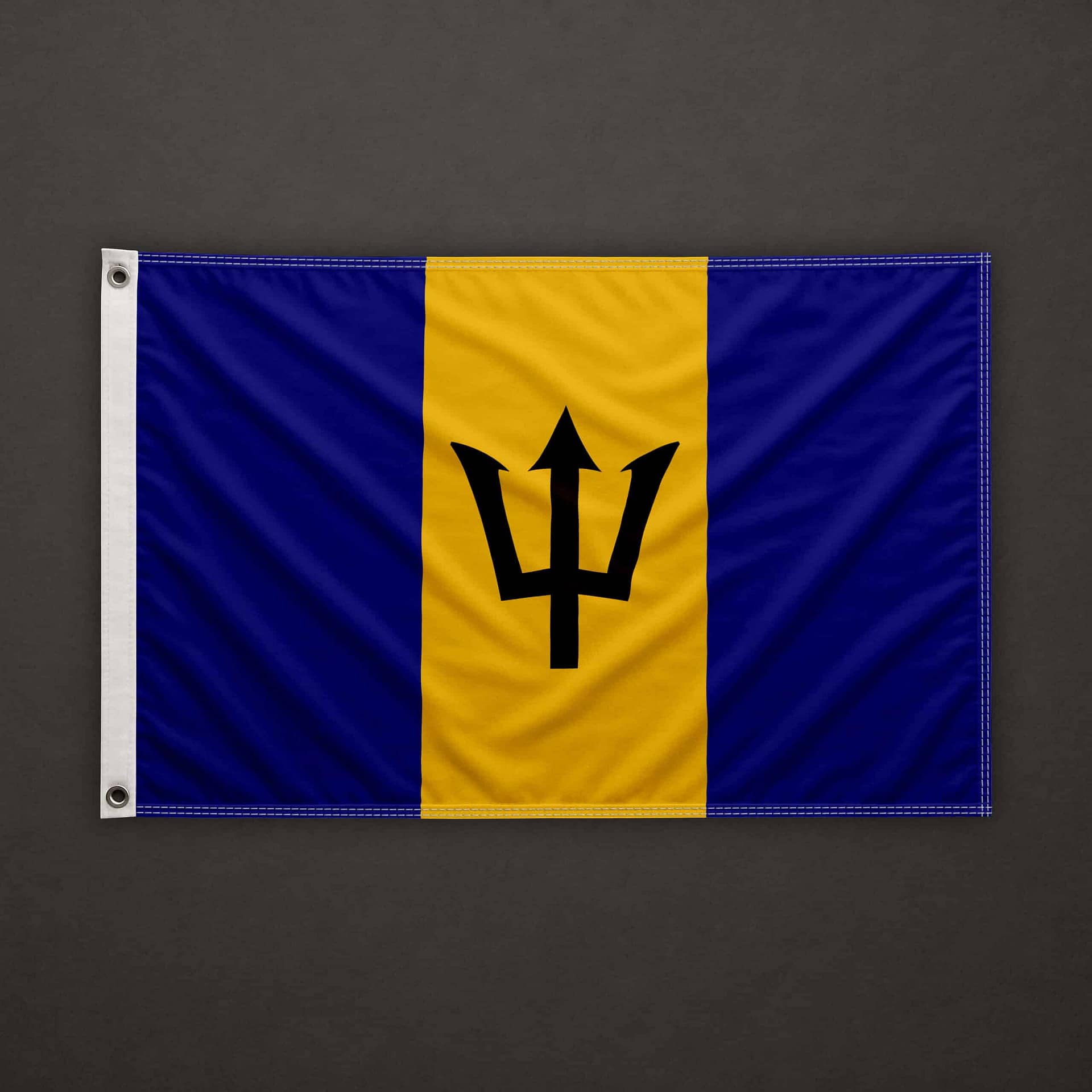 On the left side (hoist edge), a pocket for 6mm stick, open at the top and at the bottom. The top, bottom, and right sides are clean cut (hot cut). The flag is equipped with a 6mm stick already installed, 40cm long.